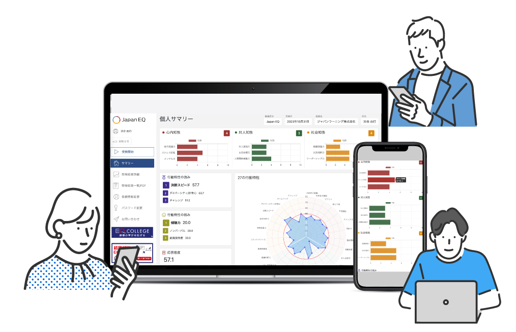 EQの開発を支援するシステムは、信頼性高い設問で行動特性の変化を数値化し、管理・分析機能を充実させ、多言語に対応しています。